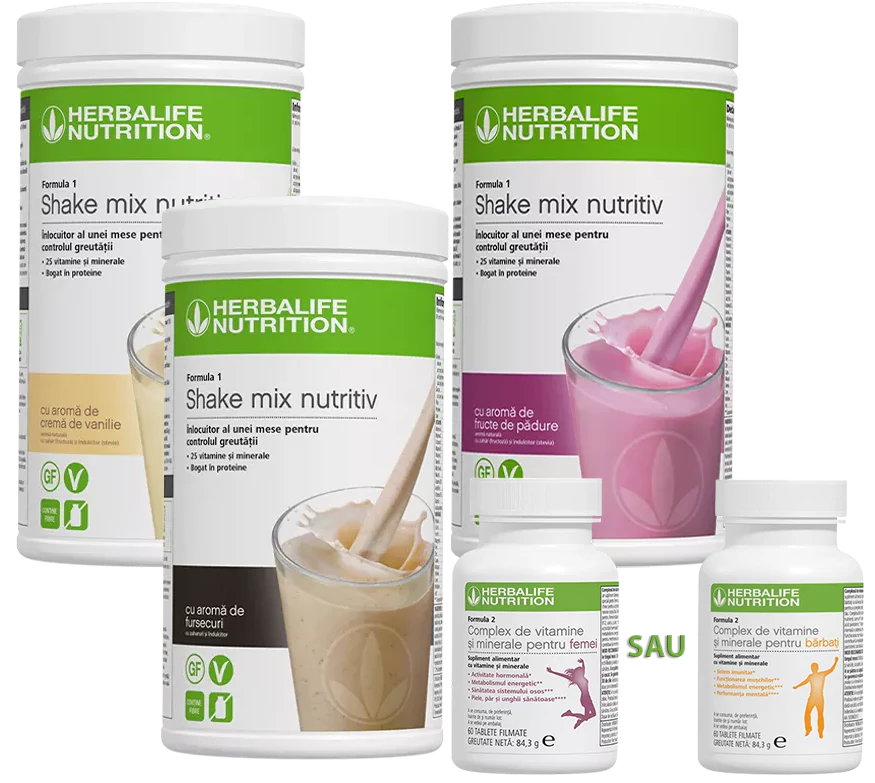 Programul de ingrasare este recomandat sa cuprinda minim: Formula 1 – Herbalife (3 cutii), Formula 2 – Complex de Vitamine si Minerale in varianta pentru Femei sau Varianta pentru Barbati .